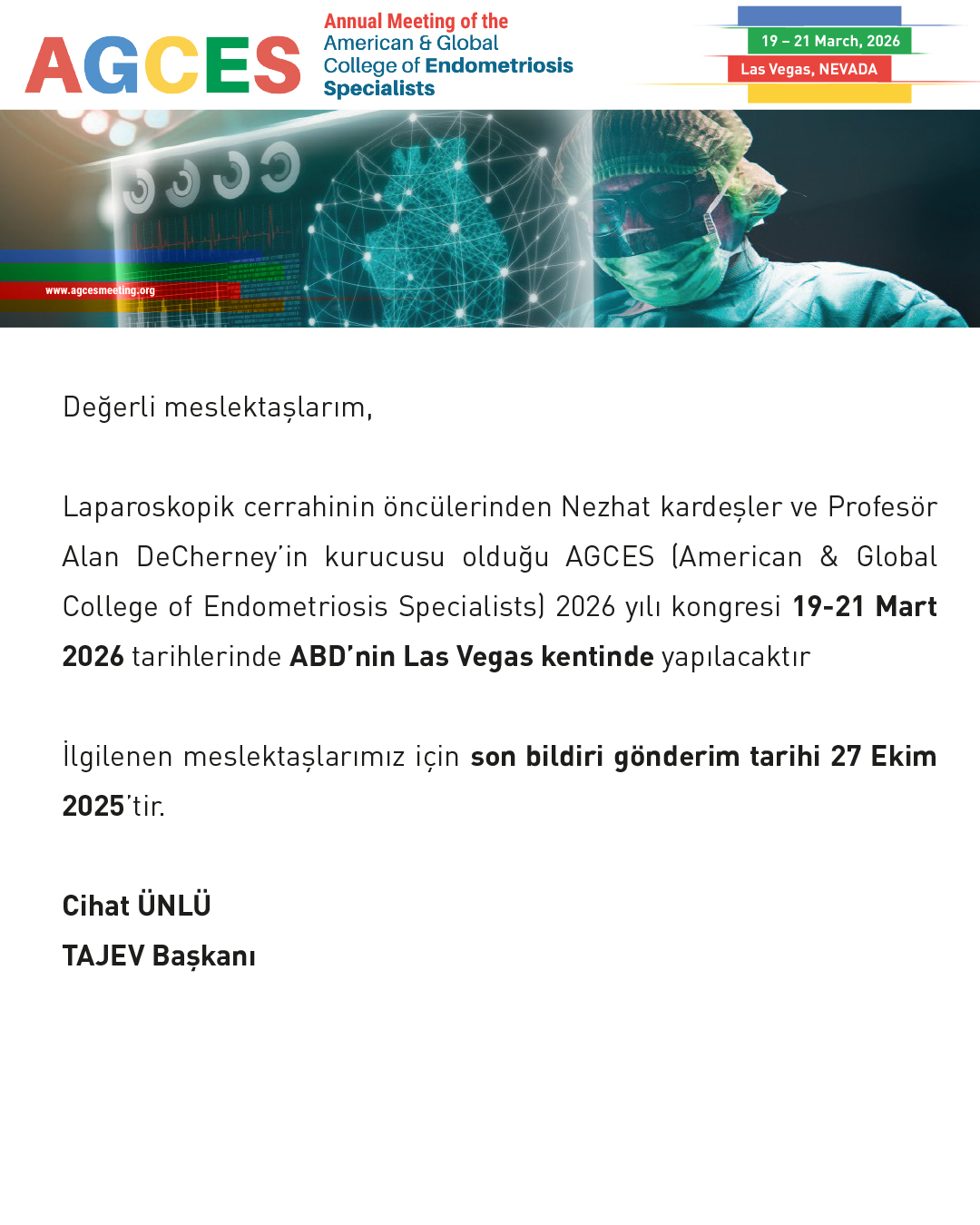 Laparoskopik cerrahinin öncülerinden Nezhat kardeşler ve Profesör Alan DeCherney'in kurucusu olduğu AGCES (American & Global College of Endometriosis Specialists) 2026 yılı kongresi 19-21 Mart 2026 tarihlerinde ABD'nin Las Vegas kentinde yapılacaktır